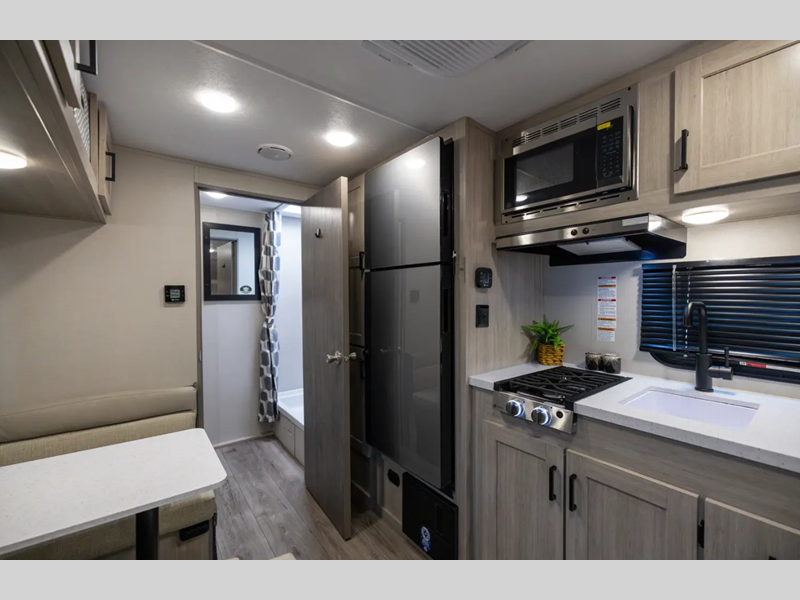 Sleeps 6 Slides 1 Length 23 ft 1 in Ext Width 7 ft 6 in Ext Height 10 ft 1 in Int Height 6 ft 6 in Hitch Weight 542 lbs GVWR 5642 lbs Dry Weight 4231 lbs Cargo Capacity 1411 lbs Fresh Water Capacity 38 gals Grey Water Capacity 30 gals Black Water Capacity 30 gals Furnace BTU 19000 btu Number Of Bunks 2 Available Beds Queen Refrigerator Type GE 12V Refrigerator Size 10.7 cu ft Cooktop Burners 2 Shower Size 24" x 36" Number of Awnings 1 LP Tank Capacity 20 lbs. Water Heater Type Tankless On Demand AC BTU 13500 btu Awning Info 15' Electric with Multicolored LED Light Strip Axle Count 1 Number of LP Tanks 1 Shower Type Tub/Shower Combo Electrical Service 30 amp Similar Floorplans