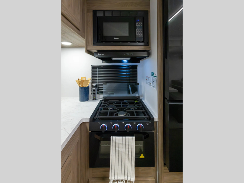 Each model is constructed with vacuum bonded walls with durable Azdel Composite, Dicor Tufflex PVC roofing, and a 3/4 gel coated fiberglass cap with an automotive glass windshield. The 81" interior height will provide more standing room, and the wear-resistant vinyl flooring is ultra durable. Head outside to find a power awning with an LED light strip, a pet leash/bottle opener, a power tongue jack, plus many more convenient amenities.
