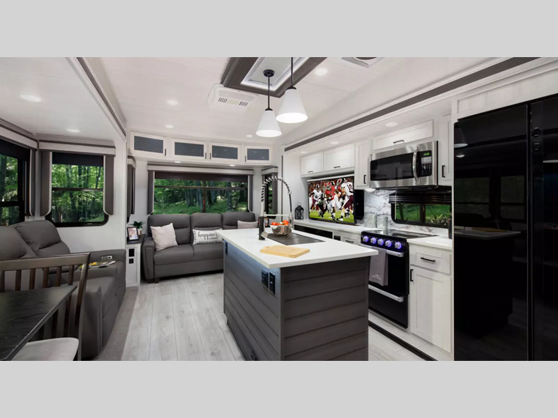 Sleeps 4 Slides 3 Length 36 ft 11 in Ext Width 8 ft 6 in Ext Height 12 ft 11 in Hitch Weight 2315 lbs Dry Weight 12994 lbs Cargo Capacity 3321 lbs Fresh Water Capacity 64 gals Grey Water Capacity 88 gals Black Water Capacity 44 gals Furnace BTU 40000 btu Available Beds King Refrigerator Type 12V French Door with Double Drawer Freezer Refrigerator Size 16 cu ft Cooktop Burners 4 Shower Size 30" x 48" Number of Awnings 2 LP Tank Capacity 30 lbs Water Heater Type On Demand Tankless AC BTU 45000 btu TV Info LR 50" LED TV w/Swing Arm Awning Info 10' 9" and 18' Power with LED Lights Axle Count 2 Washer/Dryer Available Yes Number of LP Tanks 2 Shower Type Standard Electrical Service 50 amp Similar Floorplans