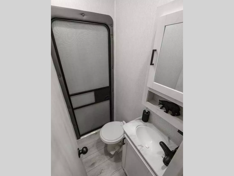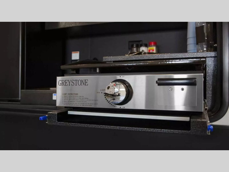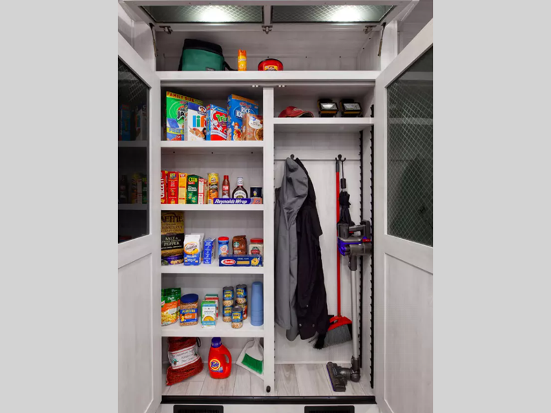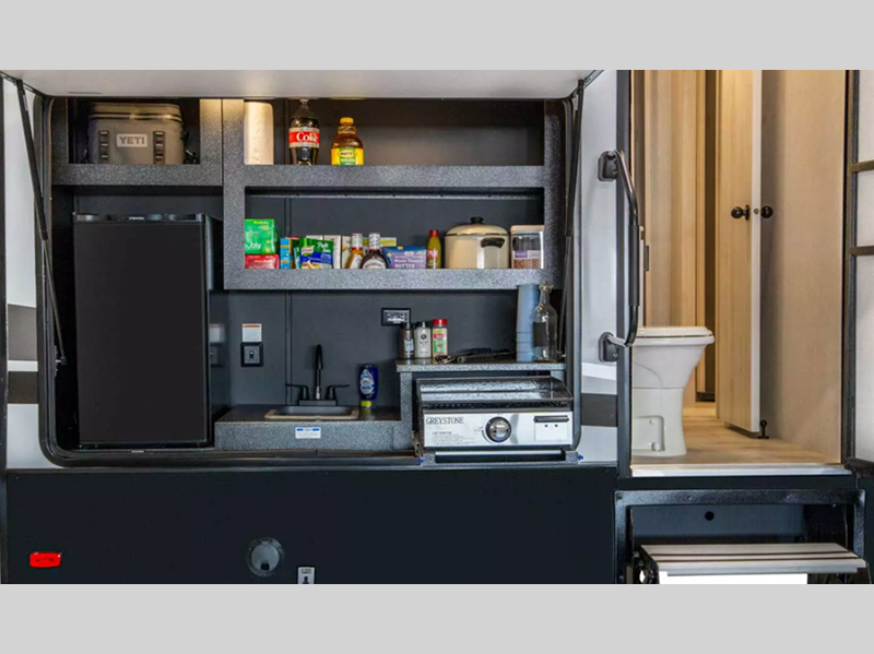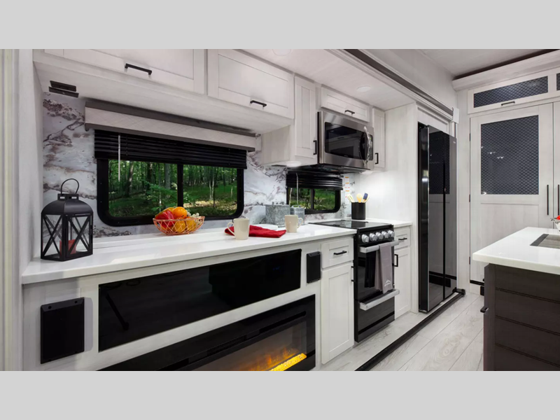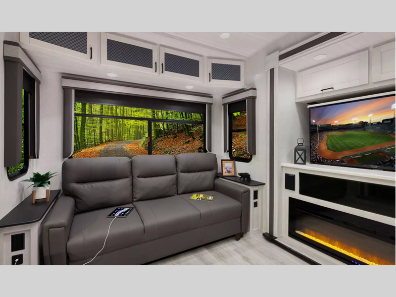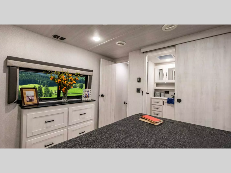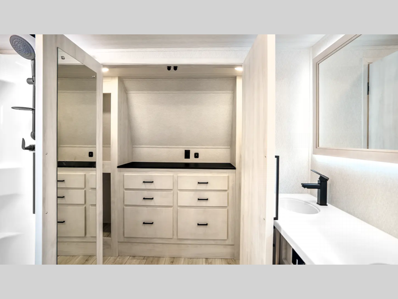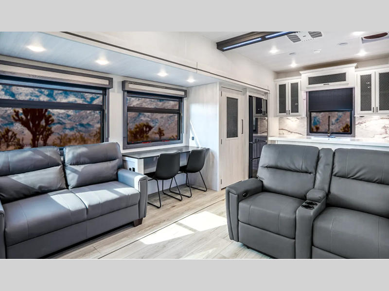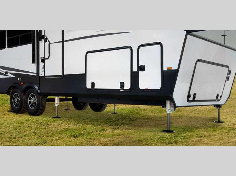 A six-point hydraulic automatic leveling system allows you to set up quickly at camp, and the second adjustable power awning with LED lights is an added layer of protection as you spend time outdoors. Inside, you'll love the solid surface countertops in the bath and kitchen, Slow Rise roller shades, and soft close hardwood cabinet doors and drawers. The Climate Package features Azdel laminated sidewalls, dual attic vents, a high-efficiency triple A/C system, and more features that will help you camp in cold and hot climates.