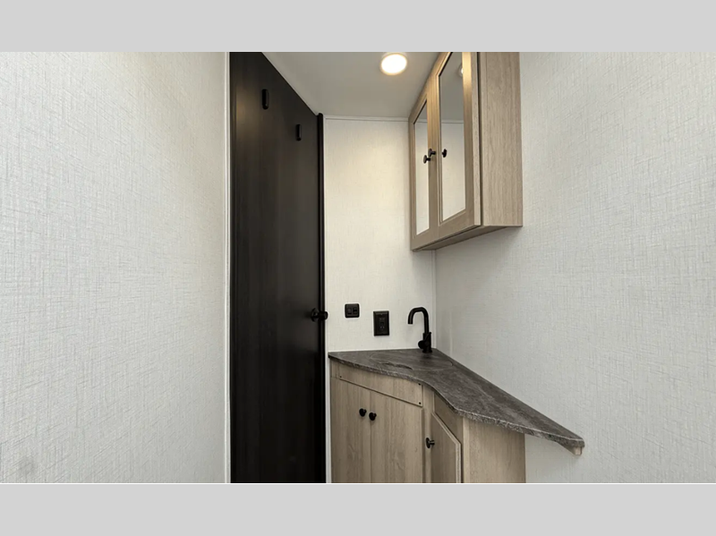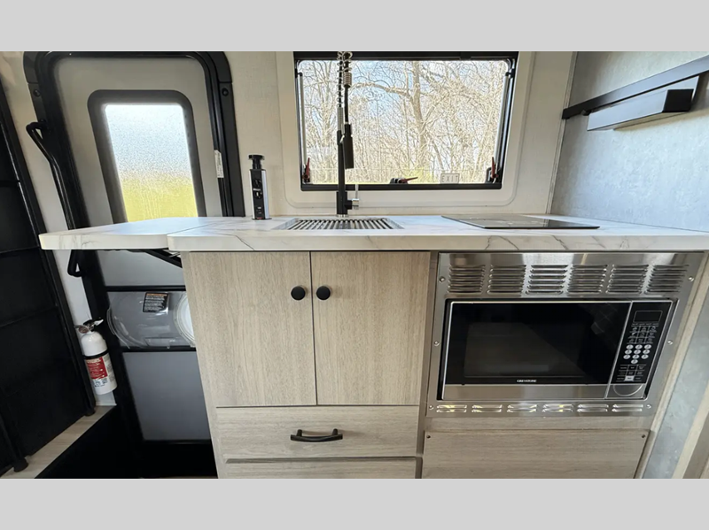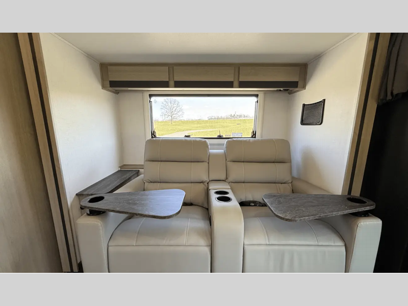 Each is built with aluminum framed laminated sidewalls and Superlite composite substrate that is water resistant, lighter than plywood, and better insulated. The interior offers power leather swivel driver and passenger seats in the cab area, soft touch self-closing drawer guides in the kitchen, a motion sensor light in the bathroom, and a 12V TV in the bedroom.