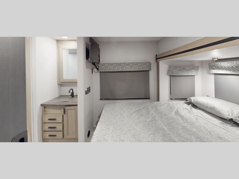Sleeps 6 Slides 2 Length 30 ft 9 in Ext Width 8 ft 5 in Ext Height 11 ft 3 in Exterior Color Standard Graphics. Moonstone, Indigo Options GVWR 14500 lbs Fresh Water Capacity 44 gals Grey Water Capacity 39 gals Black Water Capacity 39 gals Furnace BTU 30000 btu Generator 4.0KW Gas Fuel Type Gas Chassis Ford Fuel Capacity 55 gals Wheelbase 202 in Number Of Bunks 1 Available Beds RV Queen Refrigerator Type 12V Refrigerator Size 10.7 cu ft Convection Cooking Yes Cooktop Burners 3 Shower Size 24" x 36" Number of Awnings 1 Axle Weight Front 5000 lbs Axle Weight Rear 9600 lbs LP Tank Capacity 41 lbs. Water Heater Capacity 6 gal Water Heater Type DSI Gas/Electric AC BTU 13500 btu TV Info BR 12V, Bunk 12V LED Awning Info 14' Power w/ LED Lights Gross Combined Weight 22000 lbs Shower Type Standard Electrical Service 30 amp Similar Floorplans