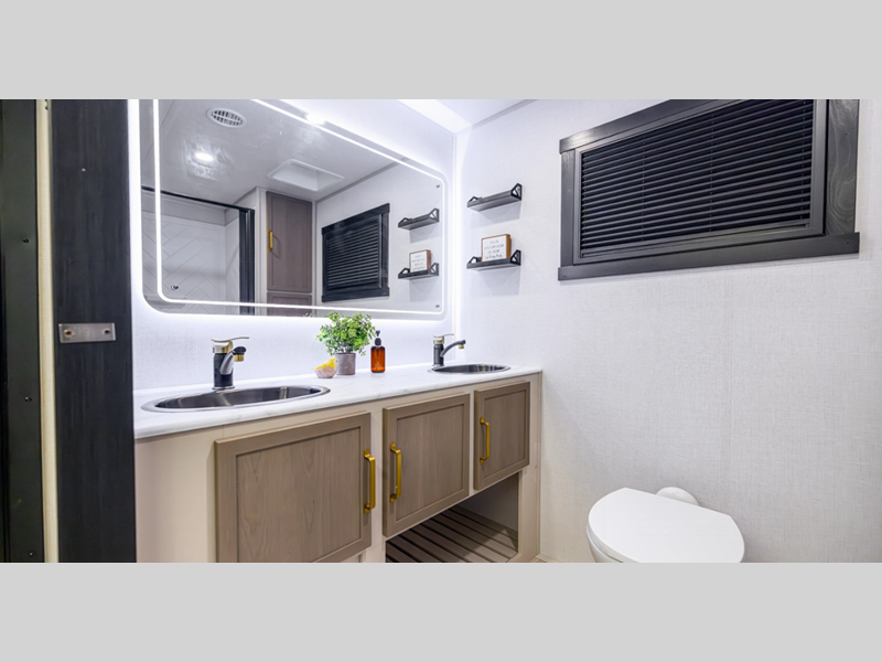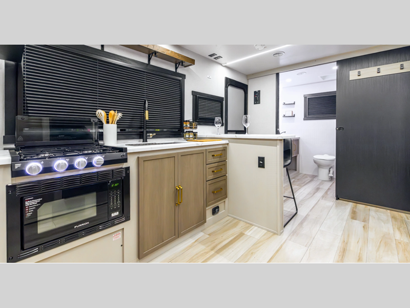 Each model is built with laminated "Aluma Frame" sidewalls and floor with block foam insulation for added durability. There is a power tongue jack with an LED docking light, along with an outside shower, and an extra large pass-thru storage for camp gear. You'll also enjoy the included Elevated Value Package that features conveniences such as square windows with built-in shades, 60K BTU On-Demand tankless water heater, and Maxxis radial tires.