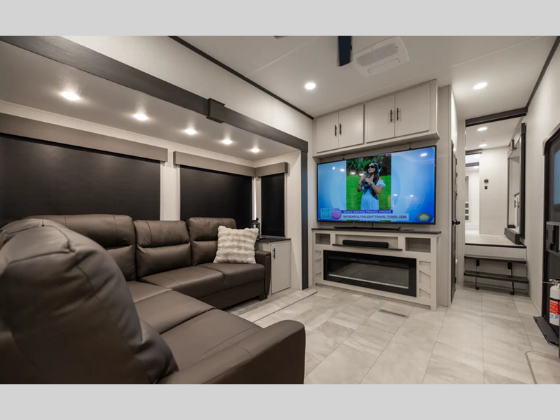 Sleeps 6 Slides 5 Length 44 ft Ext Width 8 ft 6 in Ext Height 13 ft 3 in Hitch Weight 3260 lbs Dry Weight 14814 lbs Cargo Capacity 2446 lbs Fresh Water Capacity 54 gals Grey Water Capacity 78 gals Black Water Capacity 78 gals Available Beds King Refrigerator Type 12V Refrigerator Size 16 cu ft Cooktop Burners 4 AC BTU 18000 btu TV Info LR 50" 4K Smart TV, FB 4K Smart TV Awning Info Electric Awning with LED lighting Axle Count 2 Washer/Dryer Available Yes Shower Type Standard Electrical Service 50 amp Similar Floorplans